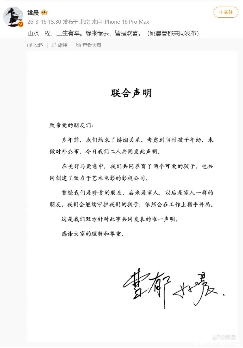 3月16日,姚晨在其个人社交平台发布由双方共同签署的联合声明,正式确认与导演曹郁结束婚姻关系,配文写道:“山水一程,三生有幸。缘来缘去,皆是欢喜。”字句温润,气韵从容,毫无悲戚之态。
